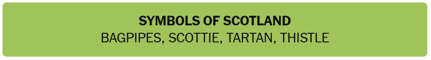 - SYMBOLS OF SCOTLAND – BAGPIPES, SCOTTIE, TARTAN, THISTLE