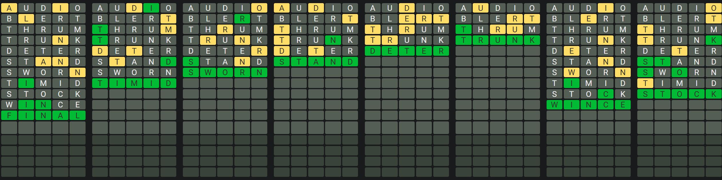 This will help you realize which letters appear in each word so you can solve the words quickly and efficiently. There may be some words that have repeated letters, so make sure you keep that in mind when guessing the words.