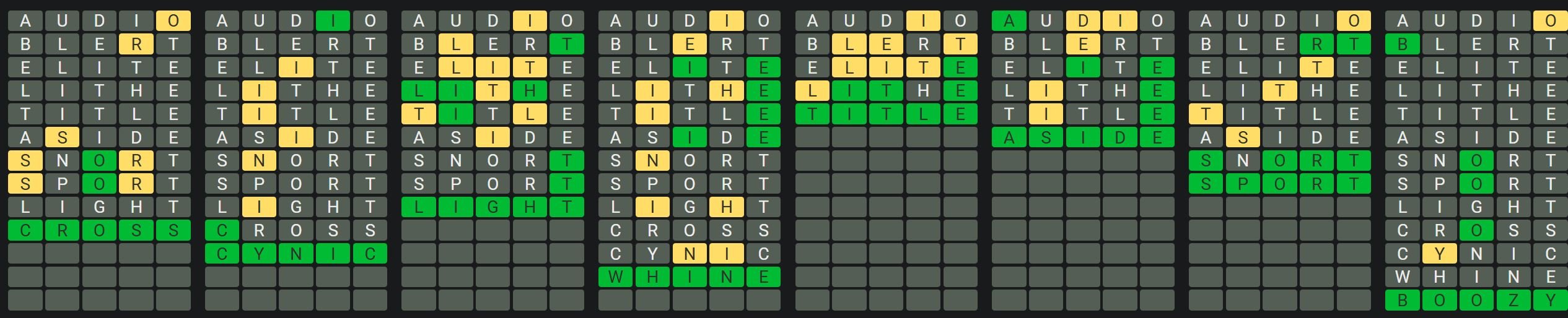 - Only one unsolved word is visible at a time. Once you solve a word, the next board is unlocked.