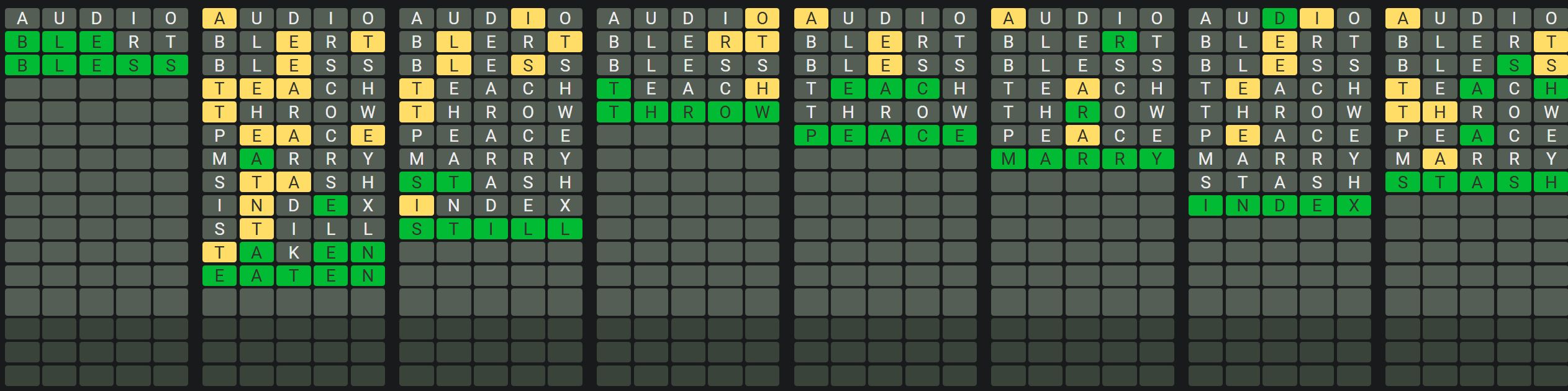 This will help you realize which letters appear in each word so you can solve the words quickly and efficiently. There may be some words that have repeated letters, so make sure you keep that in mind when guessing the words.