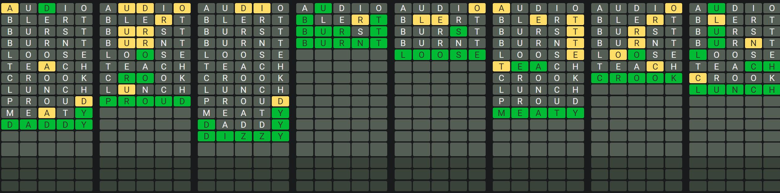 This will help you realize which letters appear in each word so you can solve the words quickly and efficiently. There may be some words that have repeated letters, so make sure you keep that in mind when guessing the words.