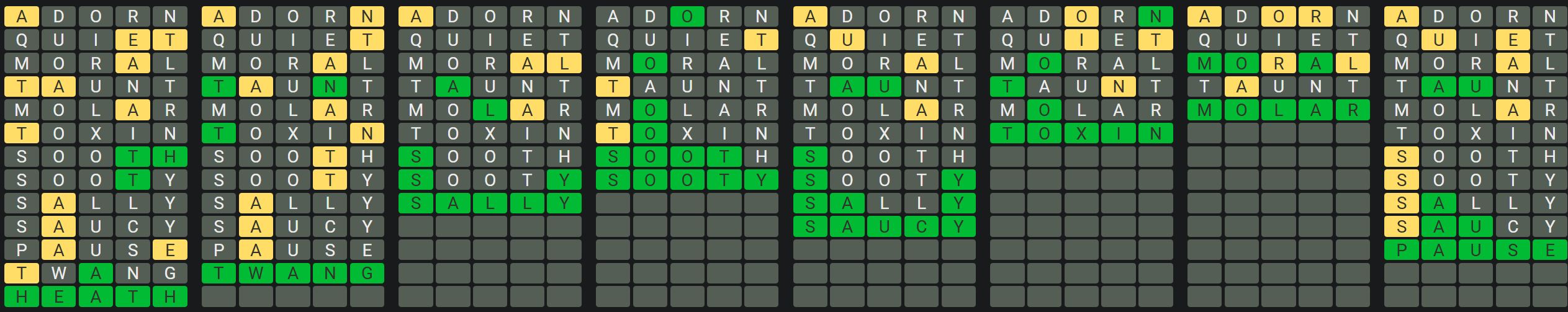 - Only one unsolved word is visible at a time. Once you solve a word, the next board is unlocked.
