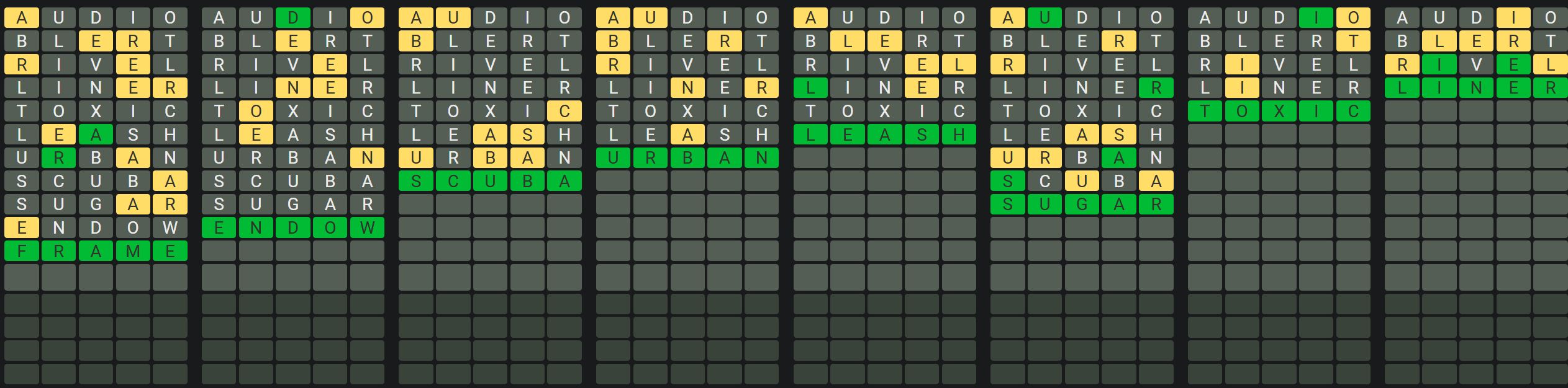This will help you realize which letters appear in each word so you can solve the words quickly and efficiently. There may be some words that have repeated letters, so make sure you keep that in mind when guessing the words.