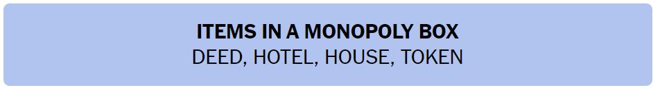 - ITEMS IN A MONOPOLY BOX – DEED, HOTEL, HOUSE, TOKEN