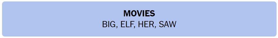 • MOVIES – BIG, ELF, HER, SAW