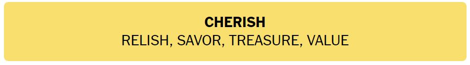 • CHERISH – RELISH, SAVOR, TREASURE, VALUE