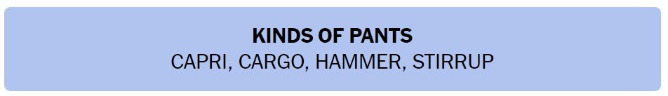 - KINDS OF PANTS – CAPRI, CARGO, HAMMER, STIRRUP