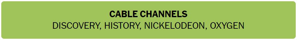 • CABLE CHANNELS – DISCOVERY, HISTORY, NICKELODEON, OXYGEN