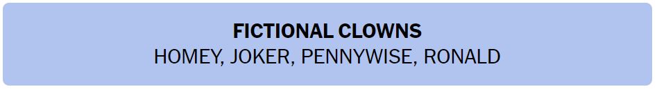• FICTIONAL CLOWNS – HOMEY, JOKER, PENNYWISE, RONALD