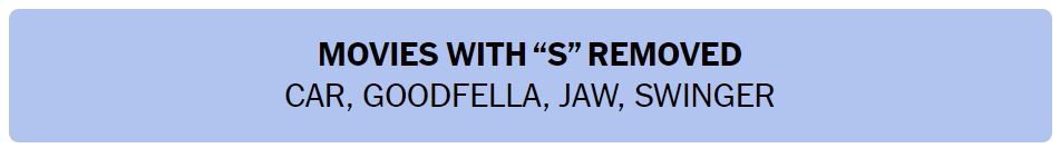 • MOVIES WITH “S” REMOVED – CAR, GOODFELLA, JAW, SWINGER