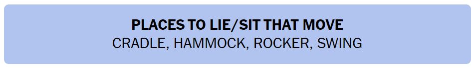 - PLACES TO LIE/SIT THAT MOVE – CRADLE, HAMMOCK, ROCKER, SWING