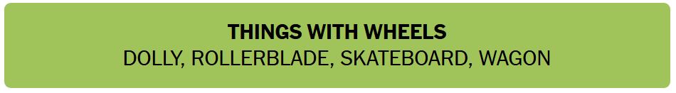- THINGS WITH WHEELS – DOLLY, ROLLERBLADE, SKATEBOARD, WAGON