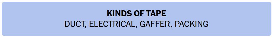 - KINDS OF TAPE – DUCT, ELECTRICAL, GAFFER, PACKING