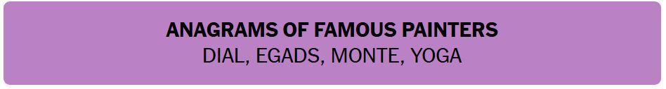 - ANAGRAMS OF FAMOUS PAINTERS – DIAL, EGADS, MONTE, YOGA