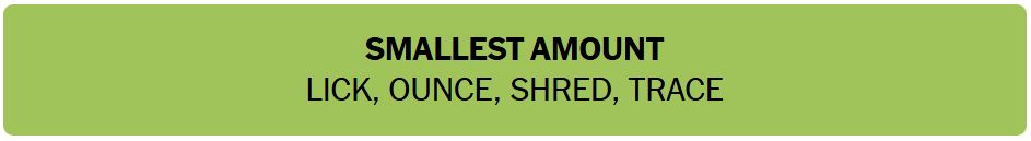 - SMALLEST AMOUNT – LICK, OUNCE, SHRED, TRACE