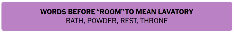 - WORDS BEFORE “ROOM” TO MEAN LAVATORY – BATH, POWDER, REST, THRONE