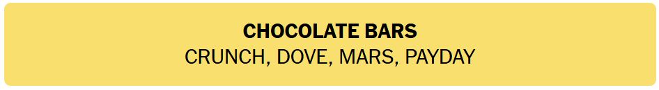 • CHOCOLATE BARS – CRUNCH, DOVE, MARS, PAYDAY