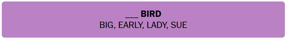 • ___ BIRD – BIG, EARLY, LADY, SUE