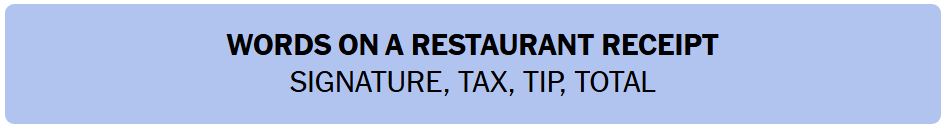 - WORDS ON A RESTAURANT RECEIPT – SIGNATURE, TAX, TIP, TOTAL