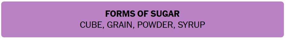 - FORMS OF SUGAR – CUBE, GRAIN, POWDER, SYRUP