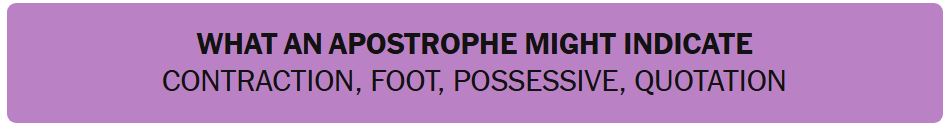 - WHAT AN APOSTROPHE MIGHT INDICATE – CONTRACTION, FOOT, POSSESSIVE, QUOTATION