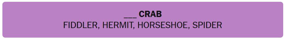 - ___ CRAB – FIDDLER, HERMIT, HORSESHOE, SPIDER