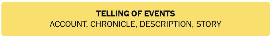 • TELLING OF EVENTS – ACCOUNT, CHRONICLE, DESCRIPTION, STORY