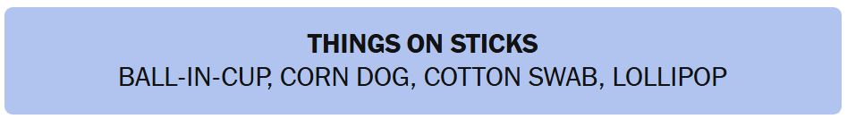 • THINGS ON STICKS – BALL-IN-CUP, CORN DOG, COTTON SWAB, LOLLIPOP