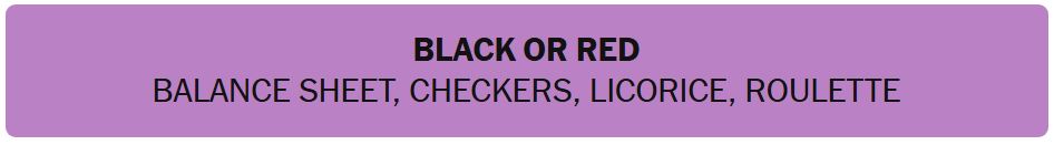 • BLACK OR RED – BALANCE SHEET, CHECKERS, LICORICE, ROULETTE