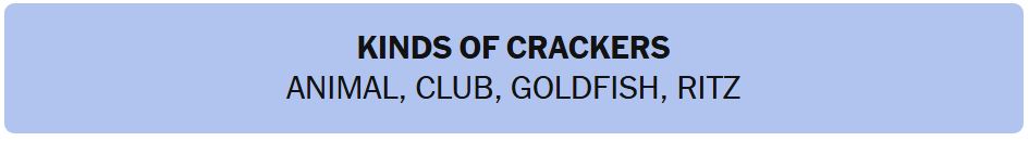 - KINDS OF CRACKERS – ANIMAL, CLUB, GOLDFISH, RITZ