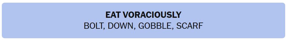 - EAT VORACIOUSLY – BOLT, DOWN, GOBBLE, SCARF