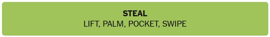 - STEAL – LIFT, PALM, POCKET, SWIPE