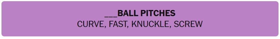 - ___BALL PITCHES – CURVE, FAST, KNUCKLE, SCREW