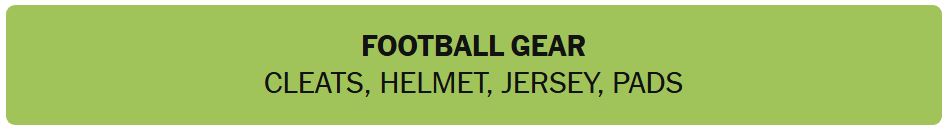 - FOOTBALL GEAR – CLEATS, HELMET, JERSEY, PADS