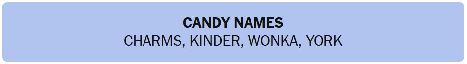- CANDY NAMES – CHARMS, KINDER, WONKA, YORK