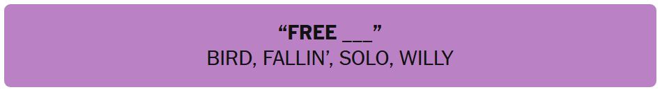 - “FREE ___” – BIRD, FALLIN’, SOLO, WILLY