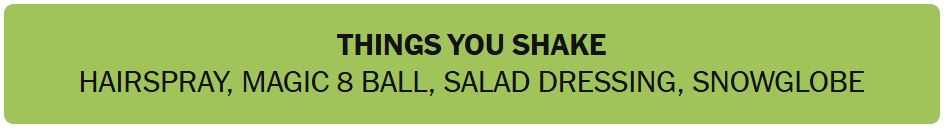 - THINKS YOU SHAKE – HAIRSPRAY, MAGIC 8 BALL, SALAD DRESSING, SNOWGLOBE