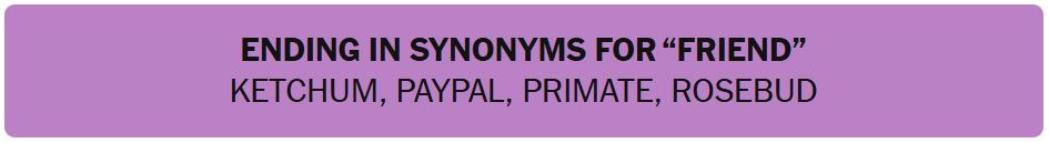 - ENDING IN SYNONYMS FOR “FRIEND” – KETCHUM, PAYPAL, PRIMATE, ROSEBUD