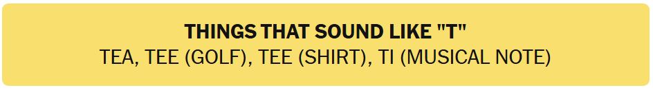 - THINGS THAT SOUND LIKE “T” – TEA, TEE (GOLF), TEE (SHIRT), TI (MUSICAL NOTE)