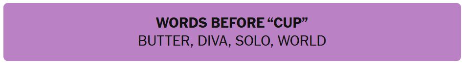 - WORDS BEFORE “CUP” – BUTTER, DIVA, SOLO, WORLD
