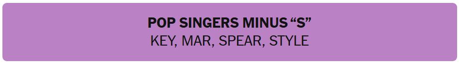 - POP SINGERS MINUS “S” – KEY, MAR, SPEAR, STYLE