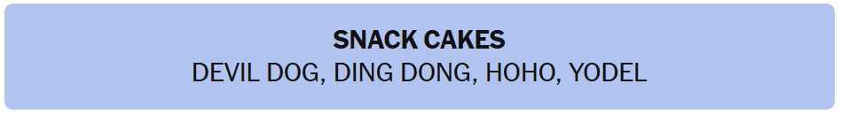 - SNACK CAKES – DEVIL DOG, DING DONG, HOHO, YODEL