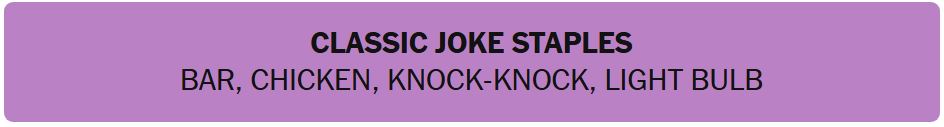 - CLASSIC JOKE STAPLES – BAR, CHICKEN, KNOCK-KNOCK, LIGHT BULB