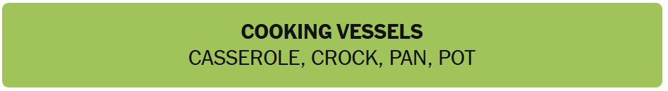 - COOKING VESSELS – CASSEROLE, CROCK, PAN, POT