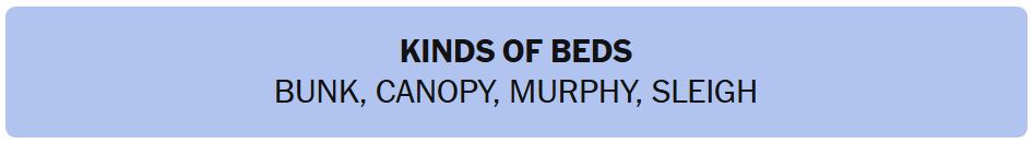 - KINDS OF BEDS – BUNK, CANOPY, MURPHY, SLEIGH