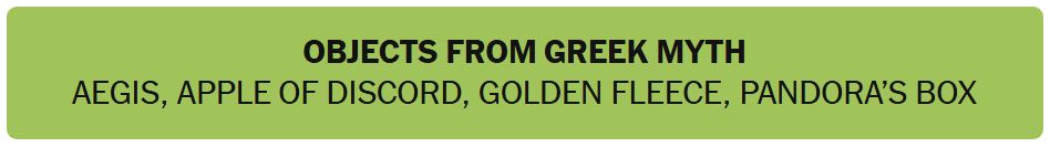 - OBJECTS FROM GREEK MYTH – AEGIS, APPLE OF DISCORD, GOLD FLEECE, PANDORA’S BOX