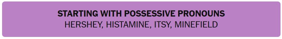 - STARTING WITH POSSESSIVE PRONOUNS – HERSHEY, HISTAMINE, ITSY, MINEFIELD