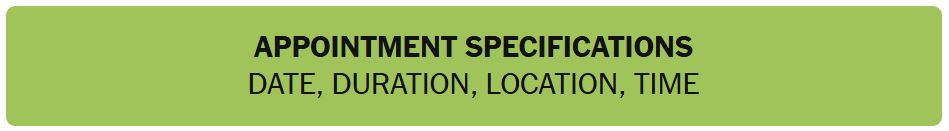 - APPOINTMENT SPECIFICATIONS – DATE, DURATION, LOCATION, TIME