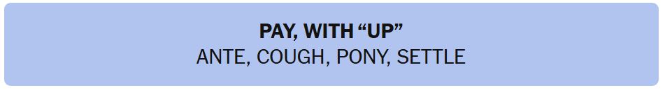 - PAY, WITH “UP” – ANTE, COUGH, PONY, SETTLE