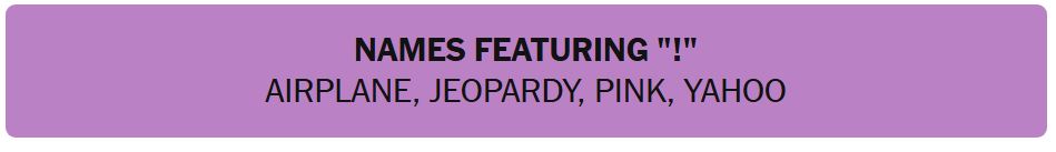- NAMES FEATURING “!” – AIRPLANE, JEOPARDY, PINK, YAHOO